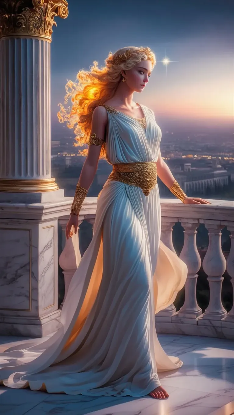 Generate divine AI art with an ethereal goddess in a flowing Grecian robe, adorned in gold, overlooking a twilight cityscape. Craft celestial elegance and mythical beauty using vivago.ai's AI image tools for cinematic, breathtaking visuals with ambient starlight and divine aura. Transform prompts into professional-grade mythical masterpieces effortlessly.