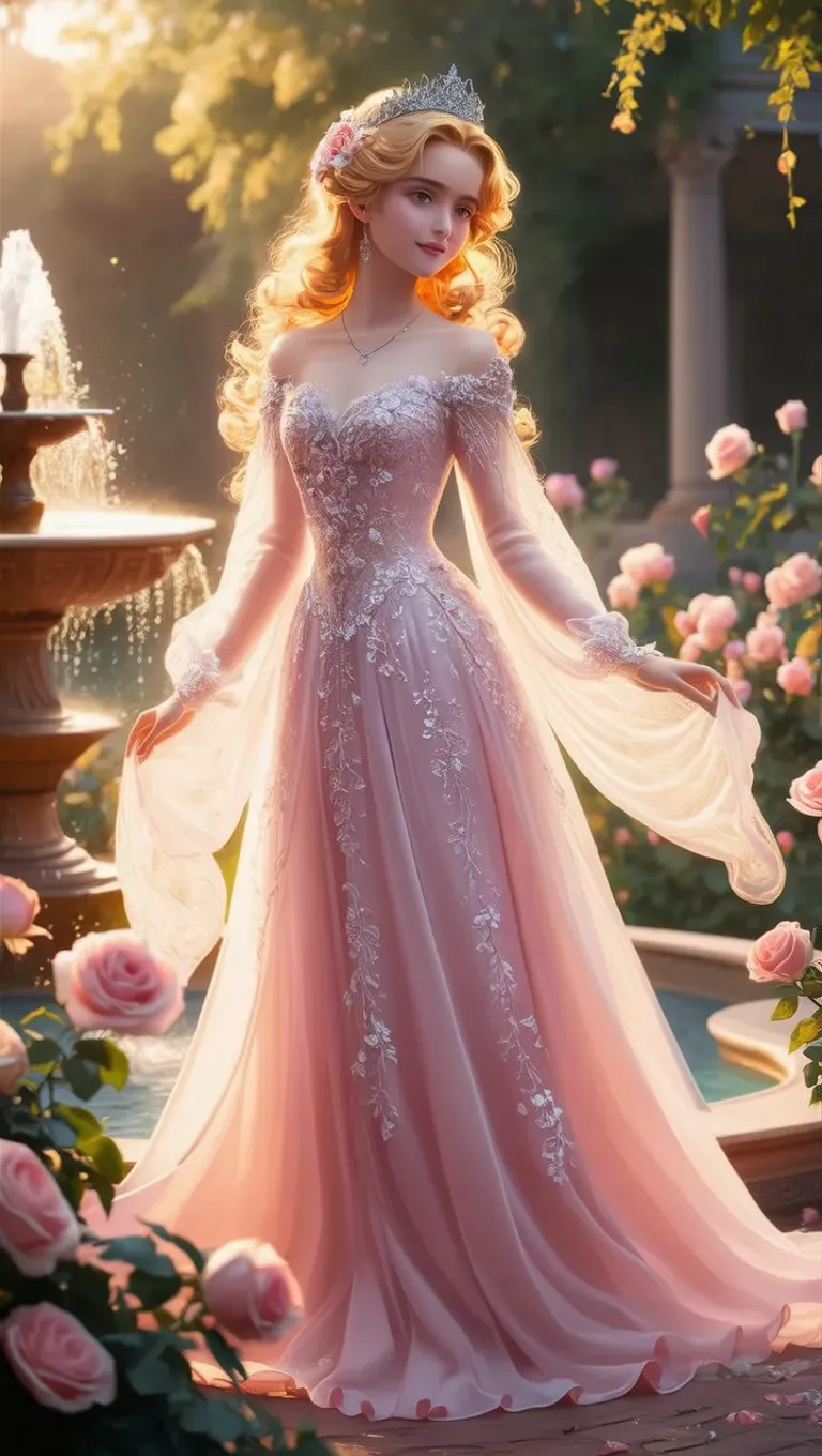 Create enchanting AI-generated visuals of a fairy-tale princess in a pastel pink gown with floral embroidery, silver tiara, and golden curls. Vivago.ai crafts cinematic scenes with blooming roses, golden hour lighting, and dreamy effects for romantic elegance. Transform prompts into professional fantasy art using advanced AI tools.