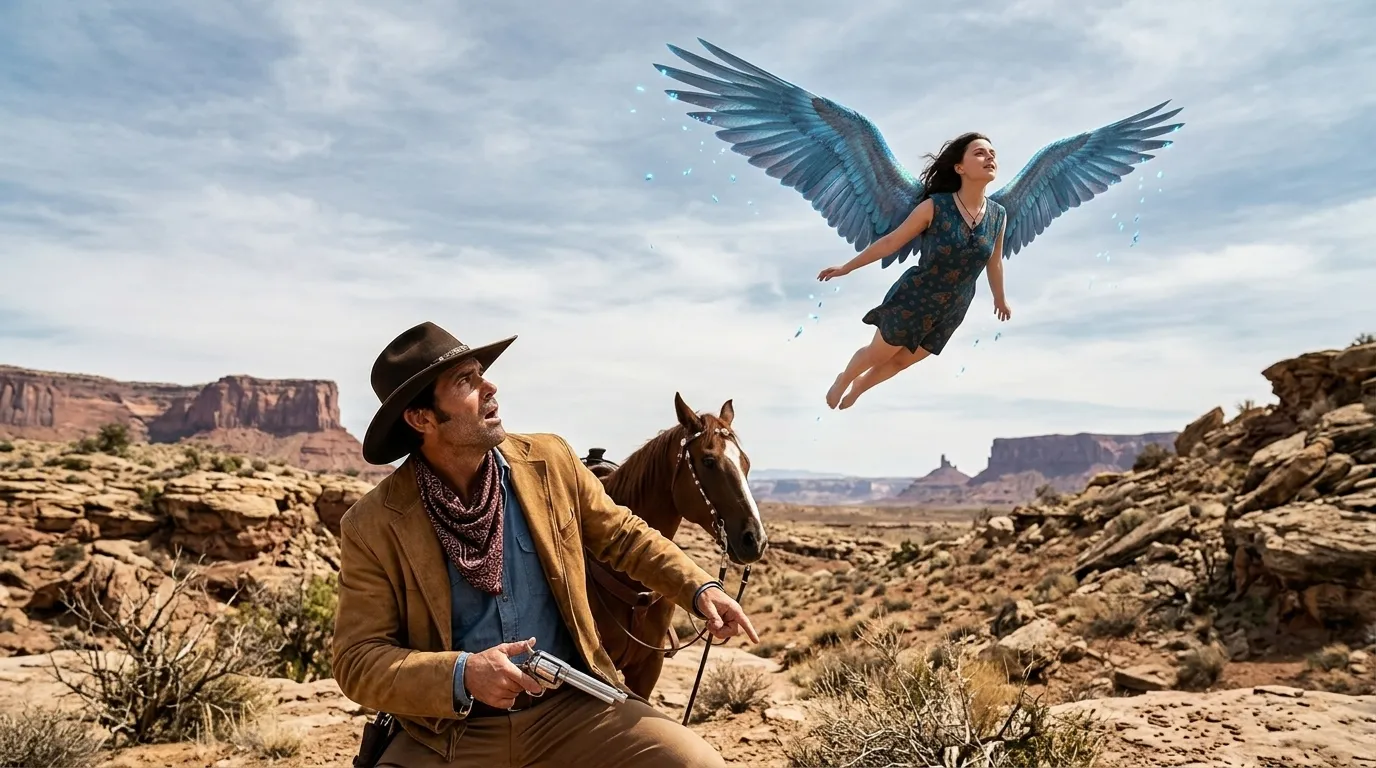Brisco County Jr hunts the girl with the blue in the wild desert.The girl shows her wings and flying away from him