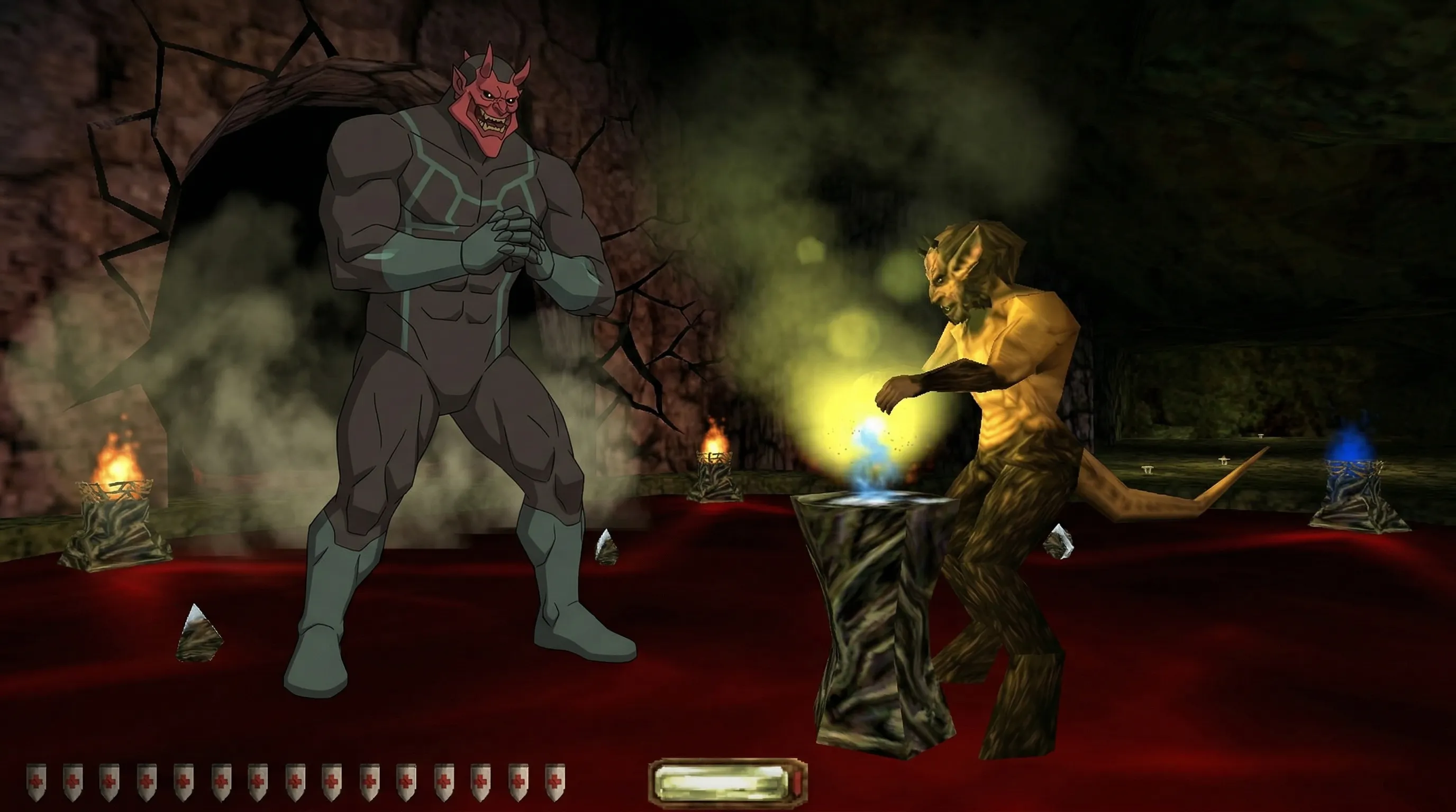 Constantine AKA The Trickster or Woodsie Lord vs Satan.The Woodsie Lord was actually doing his ritual in Maw of Chaos room and Satan interrupted him.Put Satan's legs please