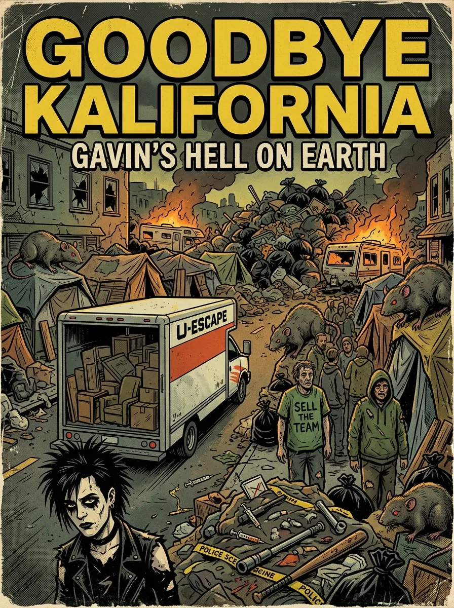 DRAW A MAGAZINE cover titled "GOODBYE KALIFORNIA GAVIN's HELL ON EARTH", dystopian urban scene in California style, rows of homeless tents lining the streets, multiple large U-Haul style moving trucks labeled U-ESCAPE driving away, enormous oversized rats crawling everywhere, piles of crime scenes with scattered weapons and broken windows, massive hills of overflowing garbage and trash bags covering the landscape, dark gritty comic book art style, chaotic and hellish atmosphere show homeless & burning RV's make it all real DRAW GOTHIC LOOK DRAW HOMELESS WEAR GREEN SELL THE TEAM SHIRTS