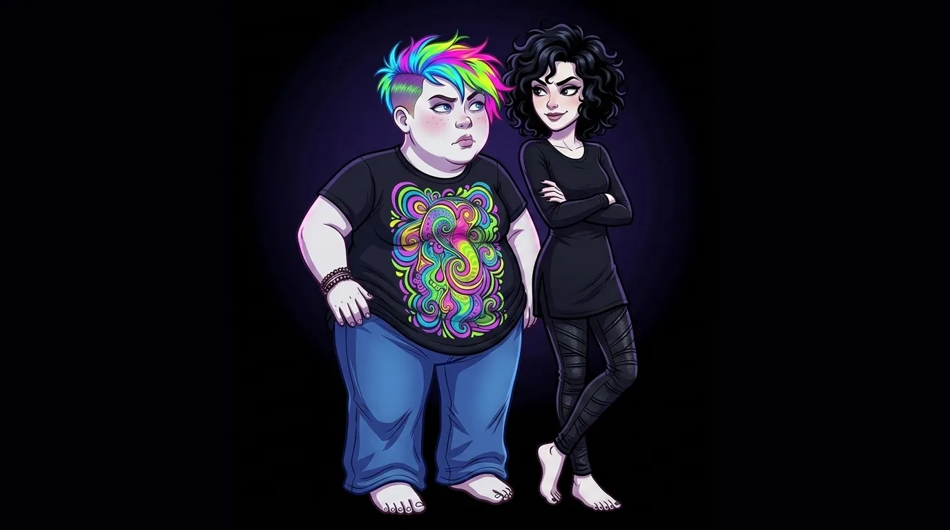please recast this woman with paler skin, and standing next to a slimmer woman, slightly taller, with curly black hair, also pale, and wearing black clothes, also barefooted