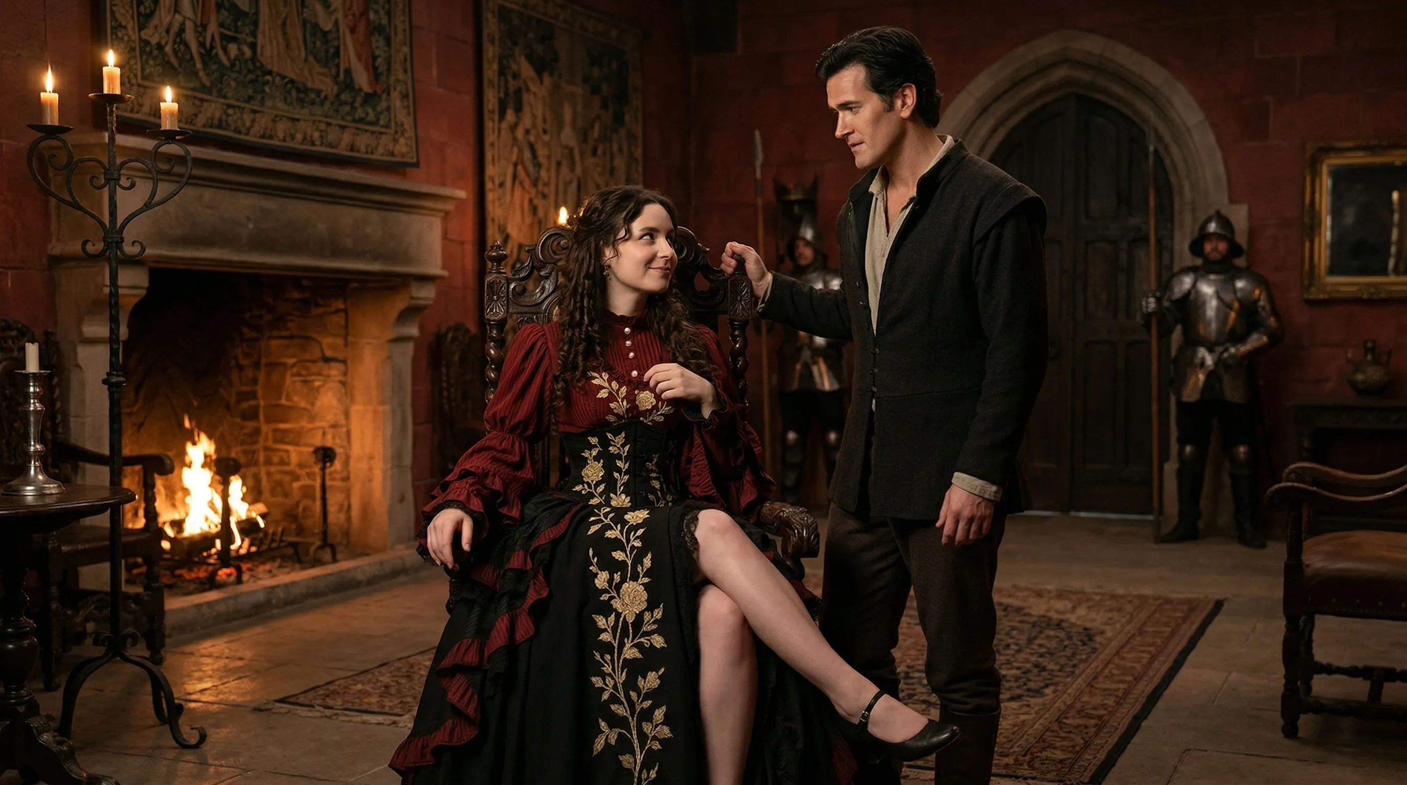 Put the dress to the girl.The girl in medieval dark red castle sitting in a chair with crossed legs posing and flerting to the young man.Remove the scar from man's right cheek please and make him clean