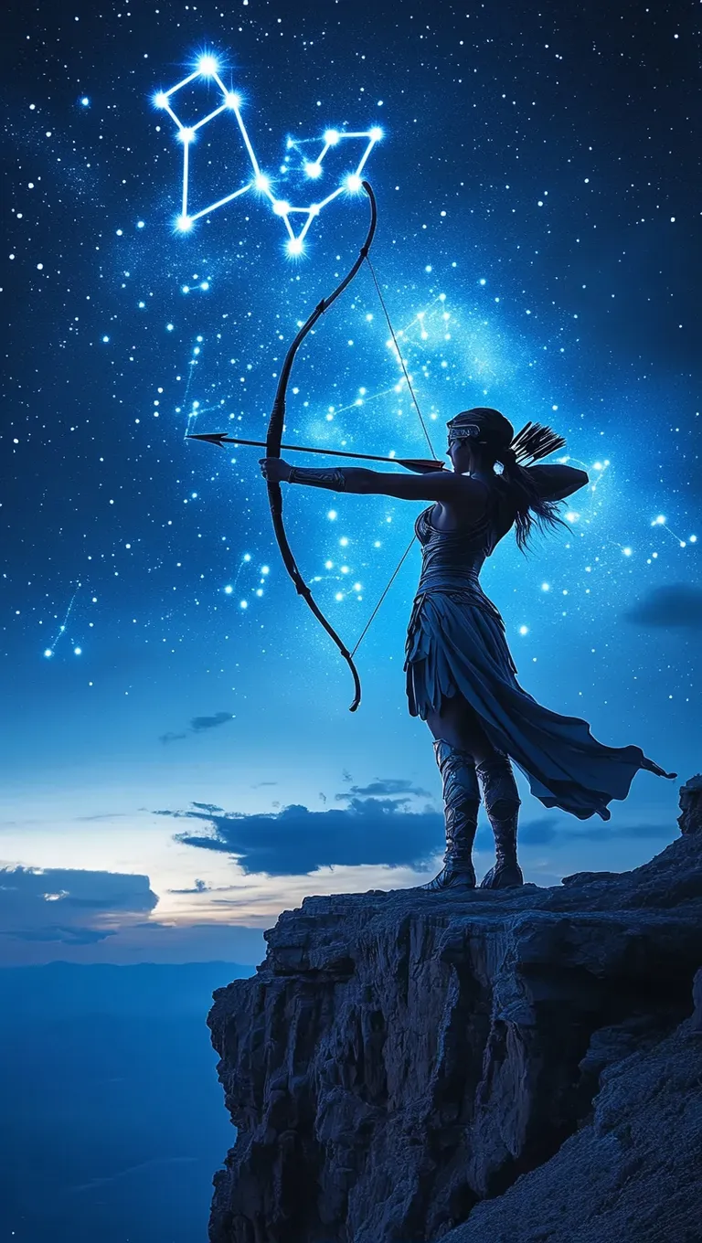 Stunning AI-generated warrior goddess art captures a celestial archer aiming at the Sagittarius constellation. Featuring vivid cosmic blue and silver hues, dynamic composition, and Lumix GH5-quality realism. Elevate your projects with celestial-themed visuals using Vivago.ai's AI image tools for professional, cosmic-inspired creations.