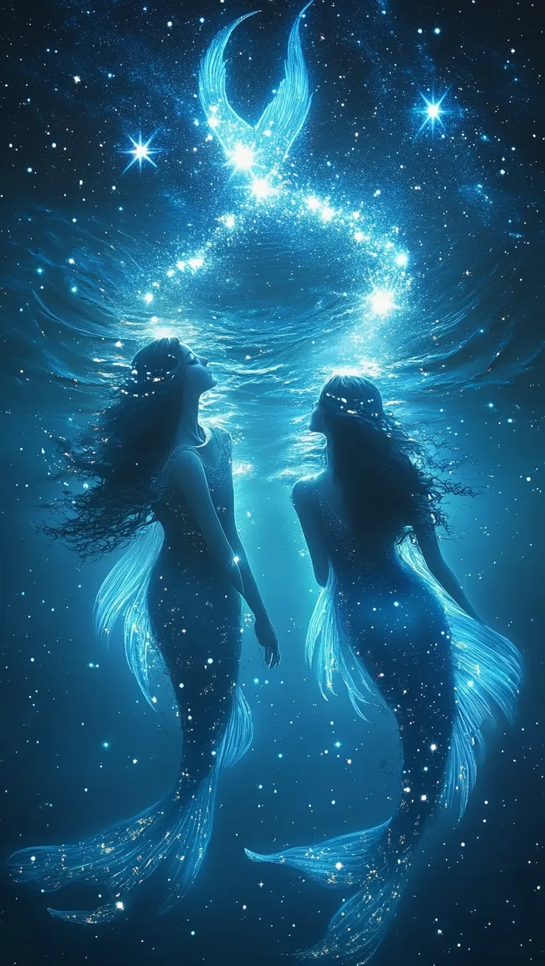 Generate mystical goddesses swimming in a cosmic sea with the Pisces constellation above, stars forming a shimmering fish pattern. Crafted via AI with a Nikon D750, 16-35mm f/4 lens effect, blending soft aquatic blues and celestial light for ethereal visuals. Elevate astral artistry with professional AI image tools for celestial, mythical creations.