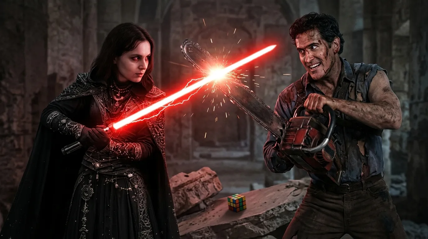 Put the dress to the girl and give to her a red lightsaber.Make her a perfect sith.The sith girl finds the young man and challenge him .The man took his chinsaw and fighting