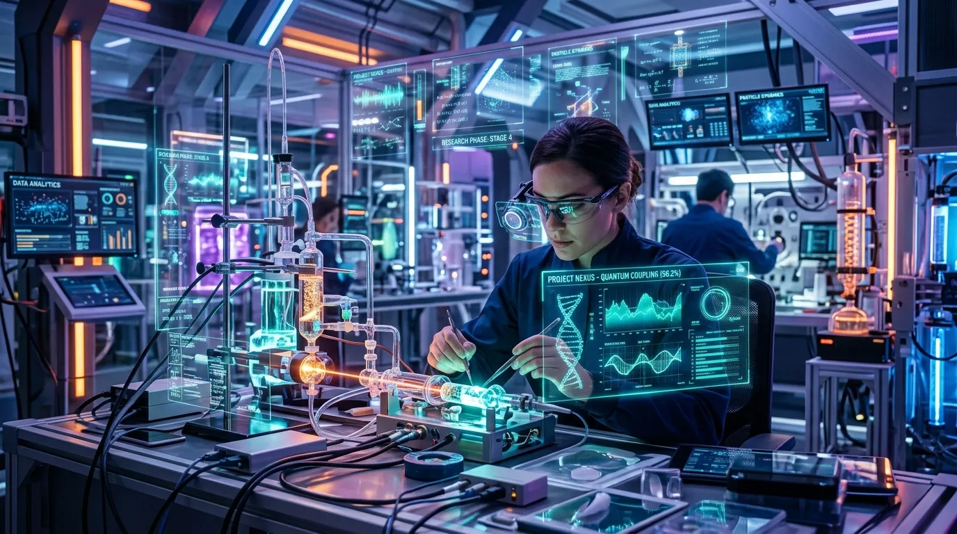 A futuristic laboratory with advanced machinery and glowing lights, where a scientist meticulously examines complex experiments, surrounded by high-tech equipment and floating holographic displays, emphasizing innovation and discovery.