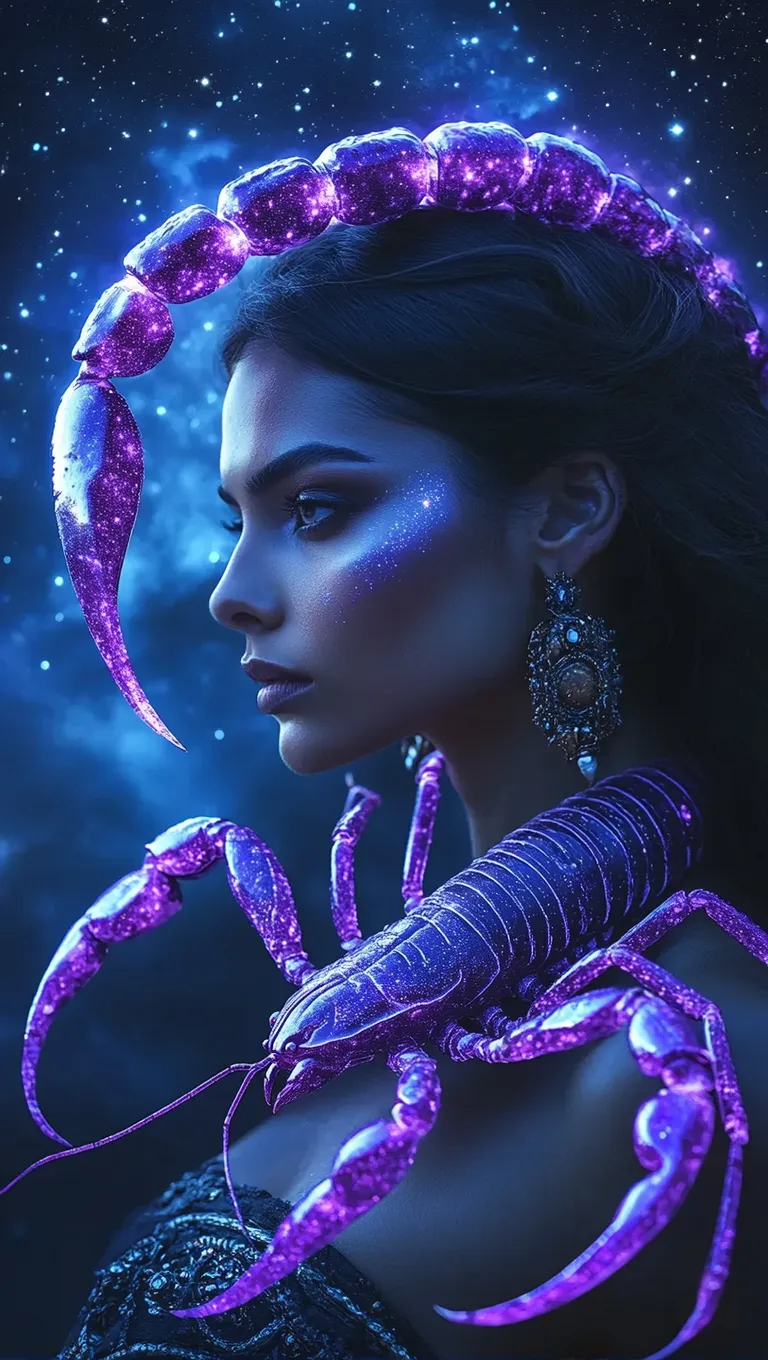 Capture the mystique of Scorpio with this AI-generated celestial goddess, framed by a glowing scorpion constellation. Dark cosmic skies, vivid blues, and ethereal purple hues evoke astrological intensity. Crafted using professional AI tools, this Leica SL2-style 50mm f/1.4 lens shot merges celestial symbolism with hyperrealistic artistry for striking, otherworldly visuals. Explore AI-powered cosmic artistry at vivago.ai.