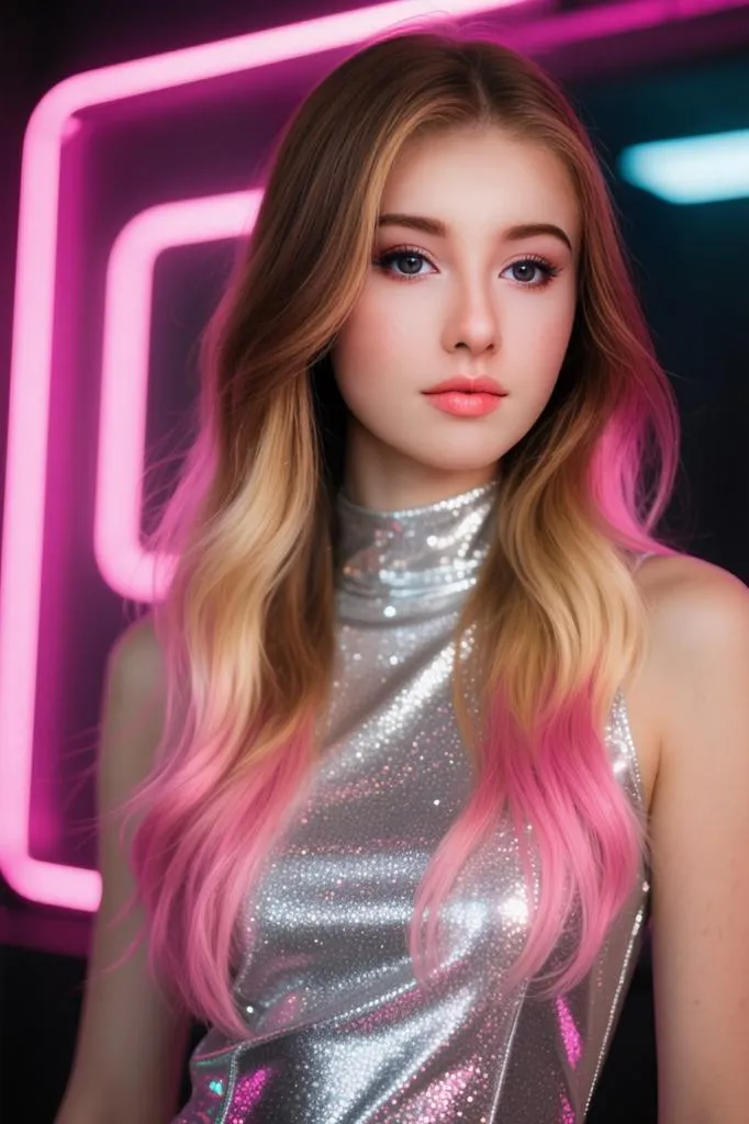 Create stunning AI-generated visuals of a glamorous futuristic woman. Featuring blonde-pink ombre hair, sparkling makeup, silver attire, and vibrant pink neon lights. Transform your vision into professional-grade art with VivaGo.ai's AI generator. Bring imaginations to life.