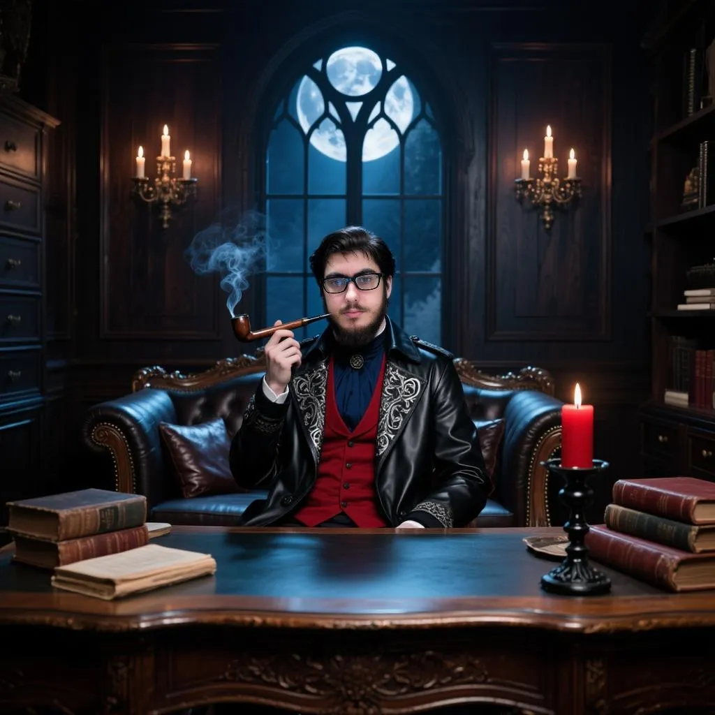 Transform text into Victorian gothic AI art. Generate a dark-academic scene: a composed man in deep red/blue attire, smoking a pipe behind an ornate desk with leather books and candlelight. Moonlight streams through a gothic window in a richly paneled room. Create moody, elegant AI images with professional-grade tools at vivago.ai.