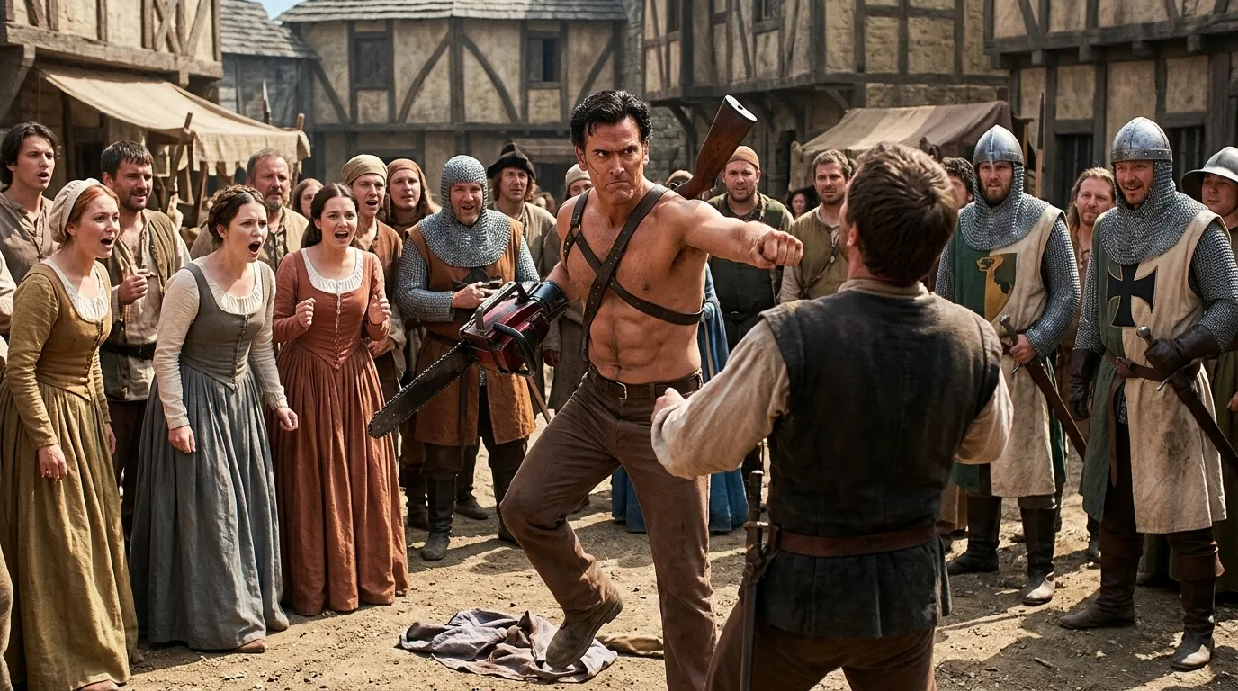 Ash dancing like Techno Viking.He drop his shirt and dancing to the guards and ladies around in medieval agae.Make him dancing like Techno Viking style