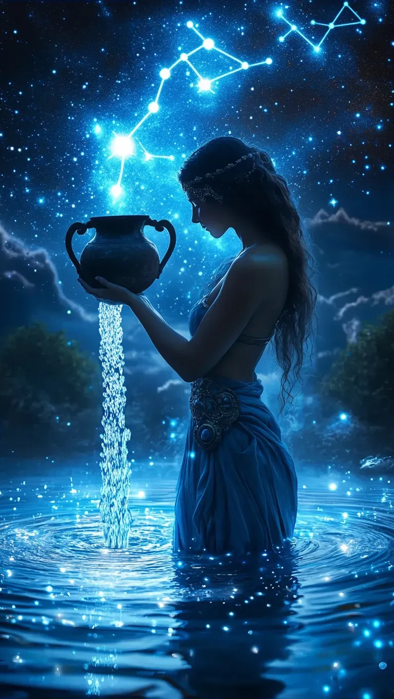 Create celestial AI-generated visuals of a goddess pouring cosmic water under the Aquarius constellation. Craft stunning night sky imagery with glowing stars, ethereal blue tones, and Sony A7 III photography effects using AI art tools for mythical, professional-grade astrological artwork and cosmic water reflections.