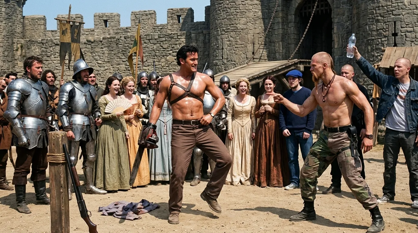 Ash dancing.He drop his shirt and dancing to the guards and ladies around in medieval agae.And Techno Viking saw him and challenge him