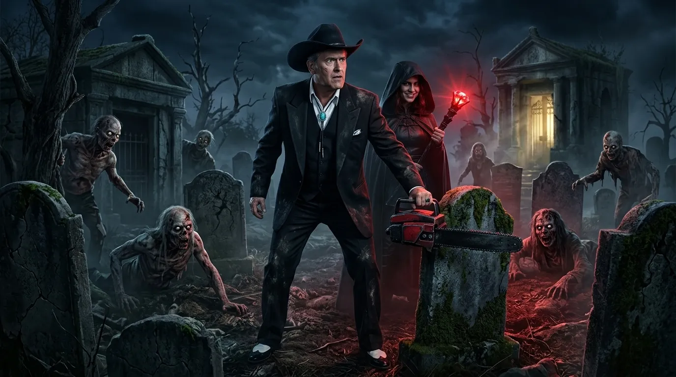 Bruce Campbell finds the witch irl and the girl transfer him in dark cemetery with deadites around.Bruce finds his chaisaw to beat them