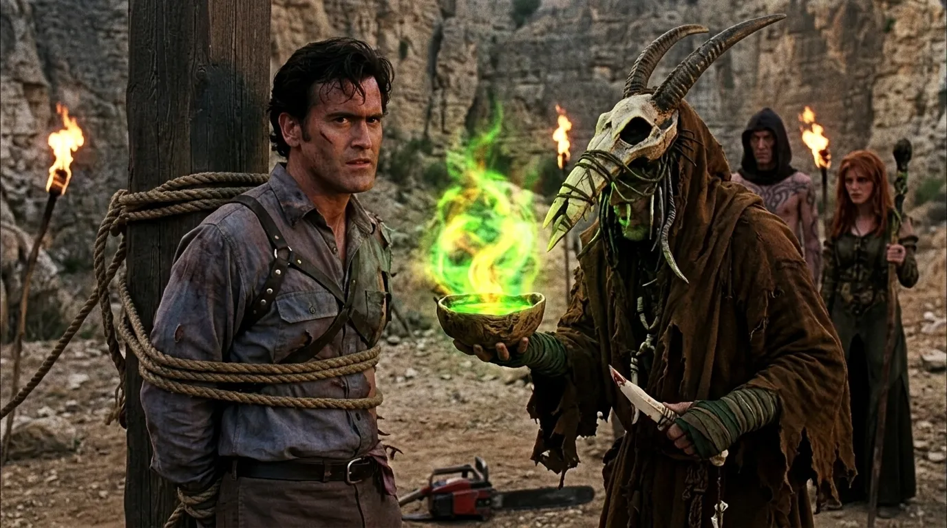 Ash has caught by Pagans.The horned Pagan Shaman gives to him a strange potion.
