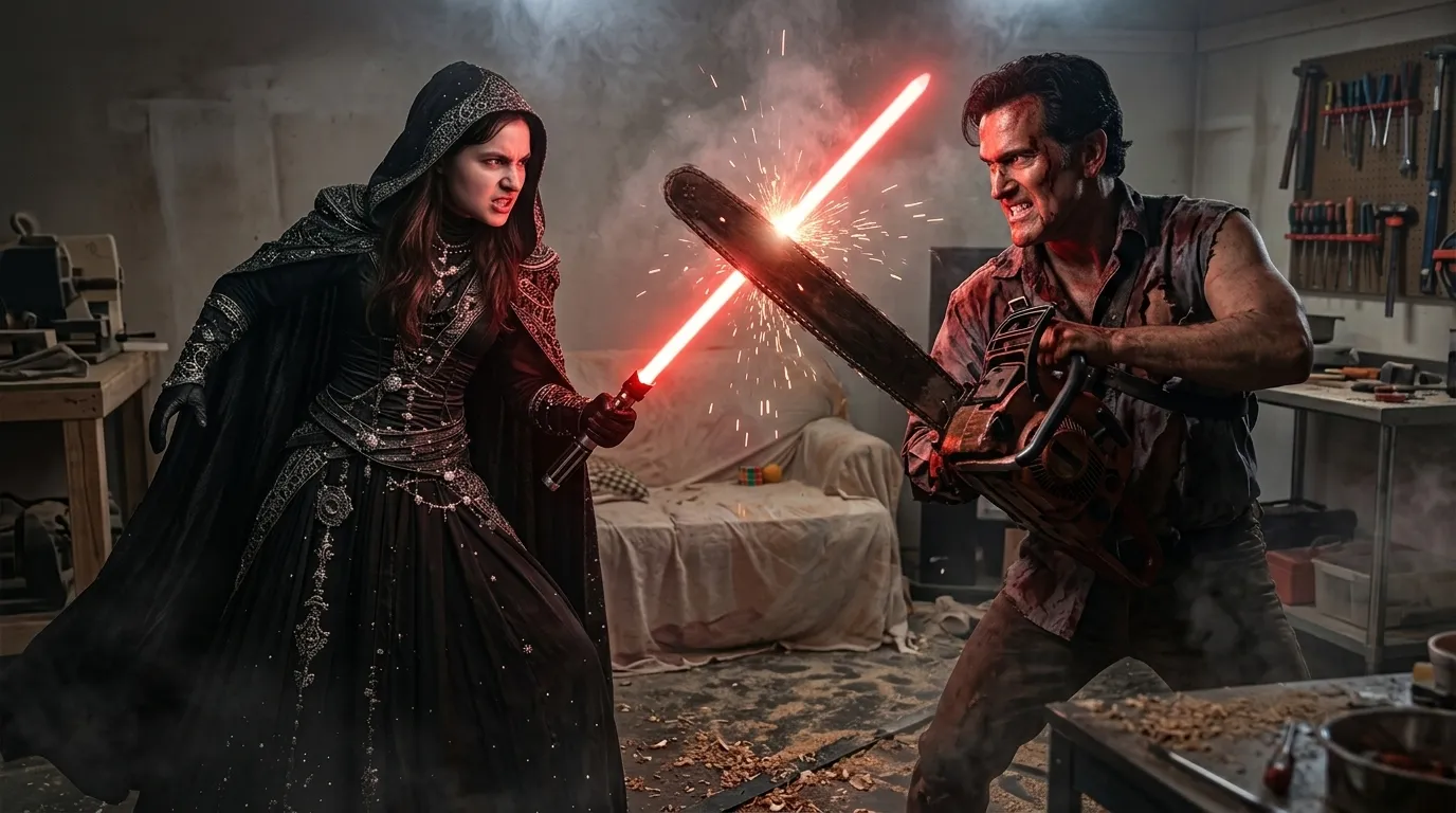 Put the dress to the girl and give to her a red lightsaber.Make her a perfect sith.The sith girl finds the young man and challenge him .The man took his chinsaw and fighting