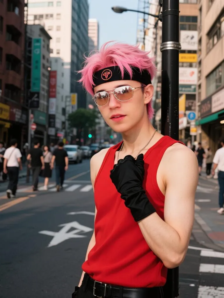 Generate a striking AI character design with pink hair and a logo headband. Featuring bold red sleeveless outfits, black gloves, and a confident stance against a busy urban backdrop. Vivago.ai creates vivid anime or game characters with dynamic street settings for maximum visual impact.