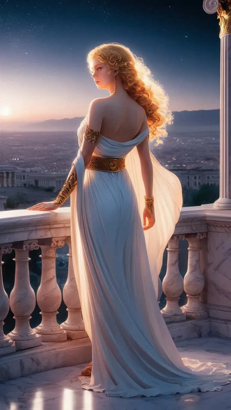 Generate divine AI art with an ethereal goddess in a flowing Grecian robe, adorned in gold, overlooking a twilight cityscape. Craft celestial elegance and mythical beauty using vivago.ai's AI image tools for cinematic, breathtaking visuals with ambient starlight and divine aura. Transform prompts into professional-grade mythical masterpieces effortlessly.