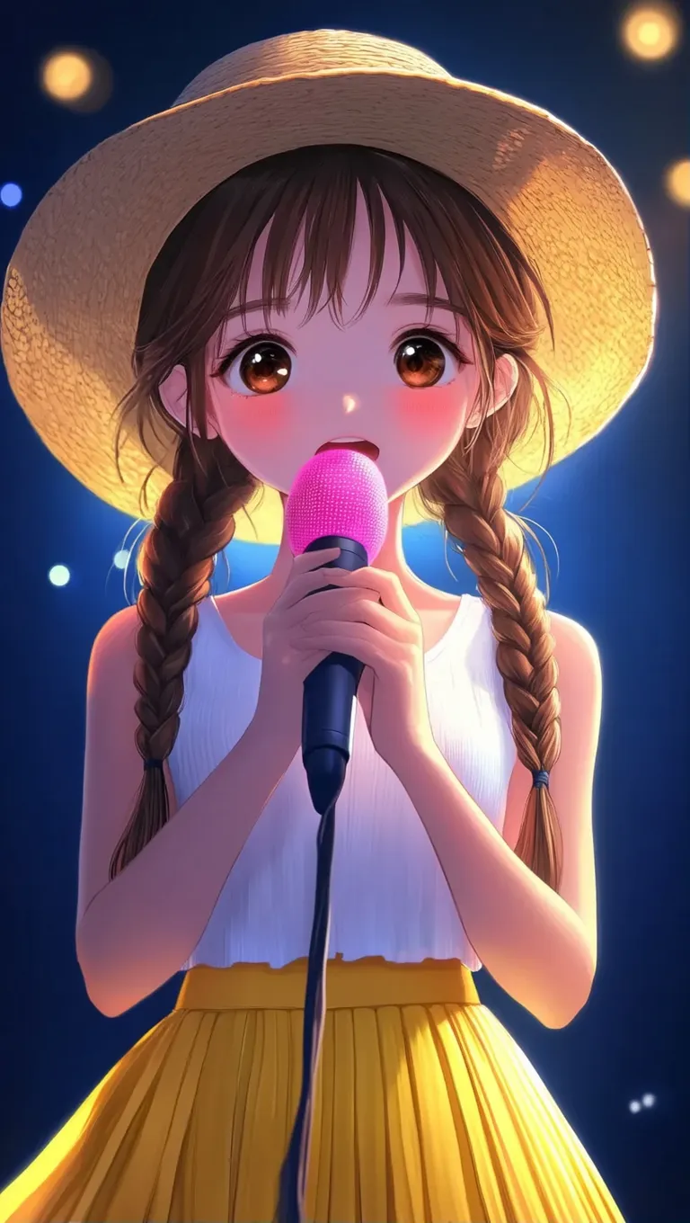 Vibrant anime artwork depicts a girl singing on stage, featuring soft brown braids, a yellow skirt, and glowing bokeh highlights. Rendered in Niji6 style with ethereal lighting, smooth lines, and dreamy shading for a magical, surreal vibe. Dark blue backdrop with subtle glows enhances depth, emphasizing polished details and harmonious composition in this AI-generated anime scene.