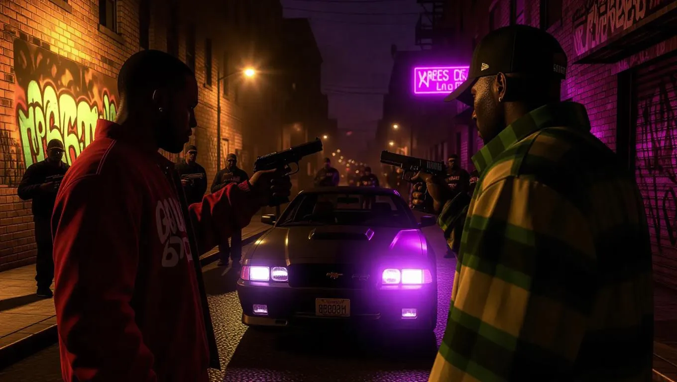 Relive GTA San Andreas' iconic gang rivalry with AI-generated 3D urban scenes. Experience the Grove Street Families vs Ballas turf war from a third-person perspective, crafting dynamic visuals true to the game's gritty aesthetic. Create immersive gangster-themed content using advanced AI tools for professional-grade results.