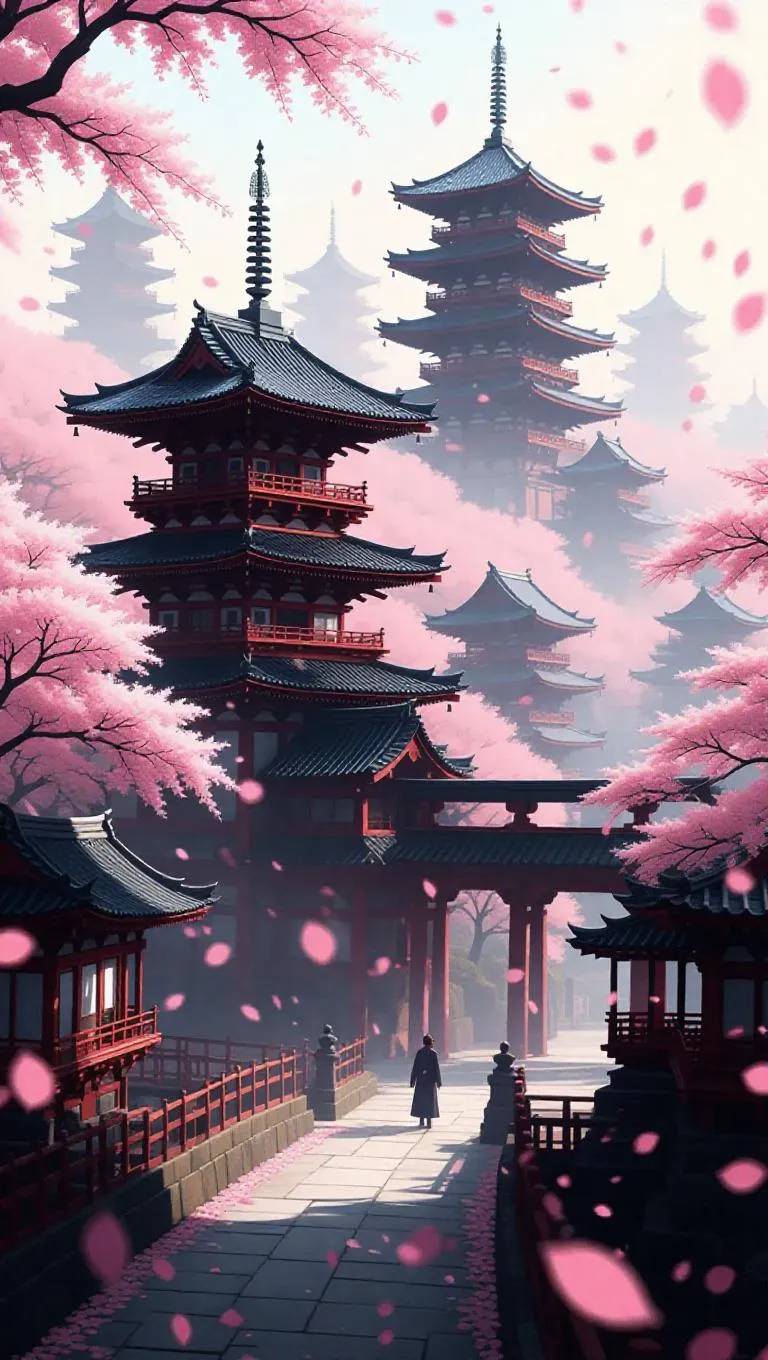 Immerse in surreal ancient Japanese architecture with AI-generated pink cherry blossoms in pastel hues. Hyperrealism meets mysticism in high-definition scroll art, blending vibrant reds, deep blacks, and ethereal grays. Transform prompts into vivid visions of Japan's ornate heritage using Vivago.ai's surreal effects.