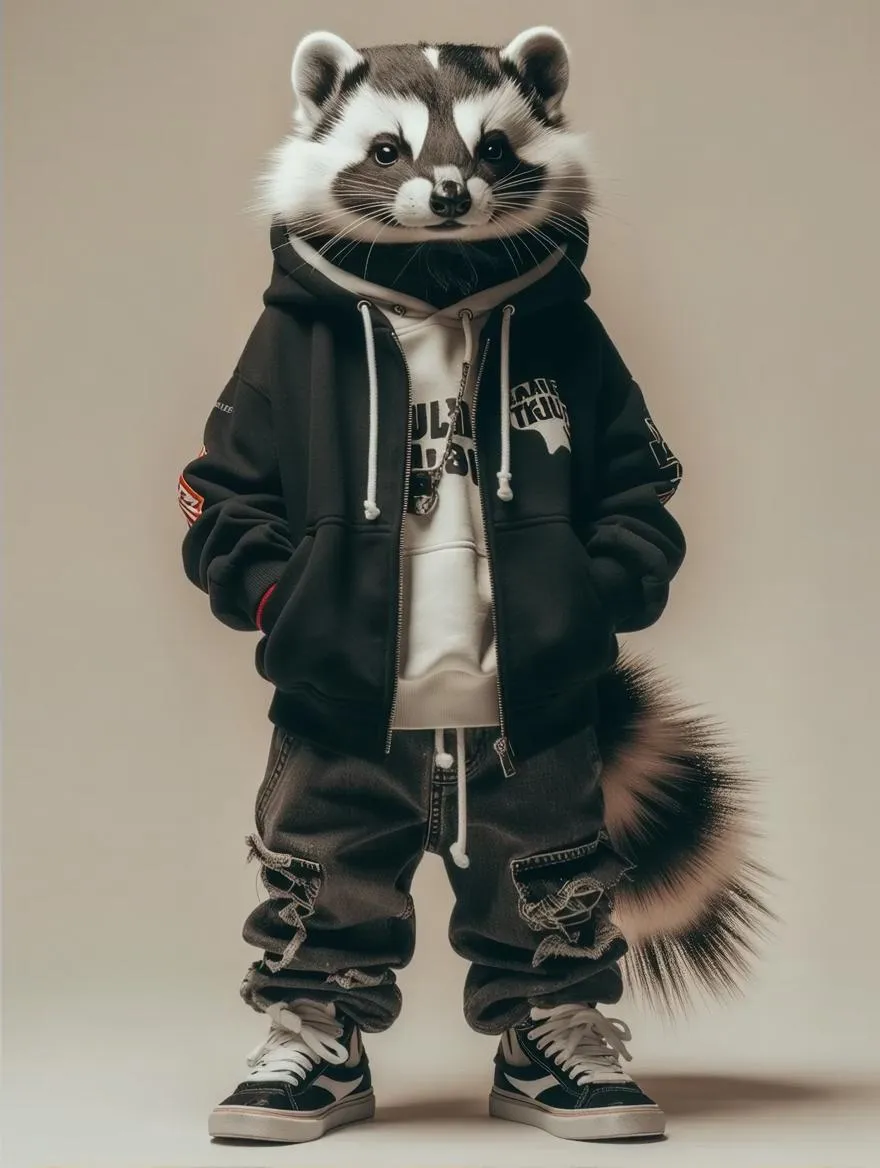 Create an AI-generated hyperrealistic anthropomorphic skunk standing tall in stylish streetwear. Full-body shot against a neutral backdrop. Transform text prompts into vivid, detailed character art with VivaGo.ai's advanced text-to-image AI generator.