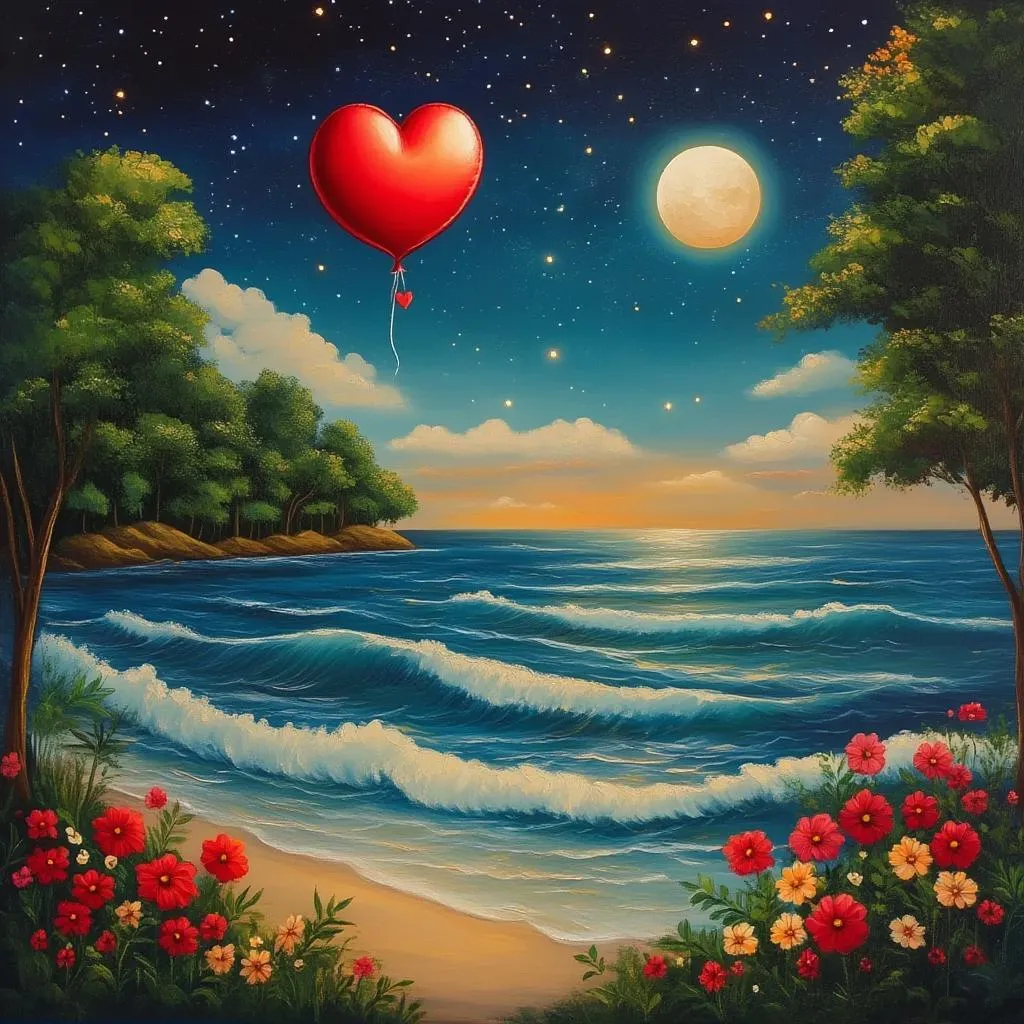 Transform your vision into a surreal nightscape with vivago.ai's AI tools. Generate a moonlit seascape featuring vivid waves, lush coastal trees, a starry sky, blooming flowers, and a striking heart-shaped red balloon. Create dreamy, professional-grade visuals effortlessly using text prompts and AI effects.
