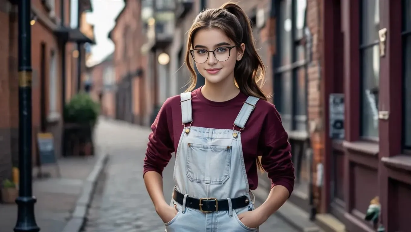 Generate AI visuals of a stylish 21-year-old brunette with glasses, ponytail, and autumn-inspired outfit: white denim overalls, black leather belt, burgundy long-sleeve shirt. Create professional AI-generated portraits effortlessly with advanced image generation tools.