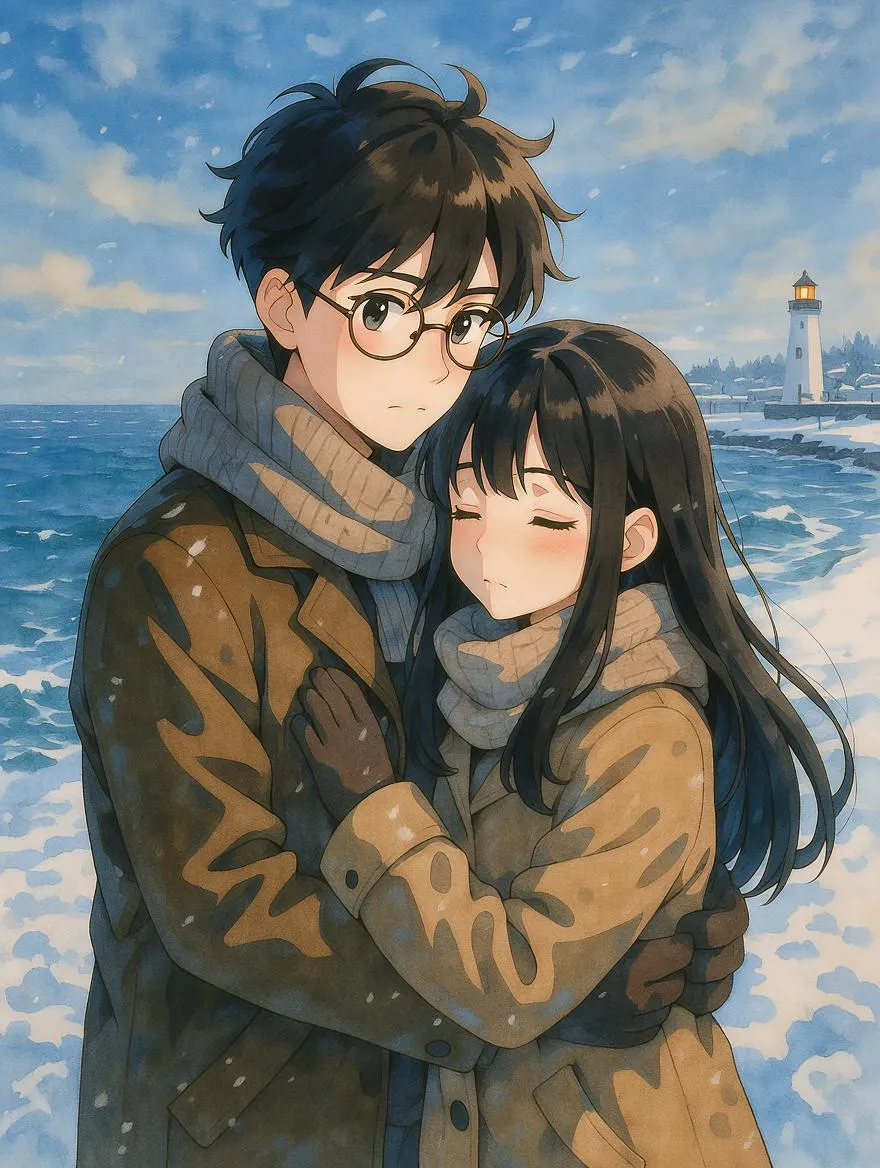Create a romantic anime couple shivering in a wintry seaside park with AI. Generate a high-res illustration featuring icy ocean winds, pink cheeks, breath clouds, snow-dusted shores, and a distant lighthouse. Experience expressive anime art with soft shading using our AI anime generator tool for stunning winter scenes.
