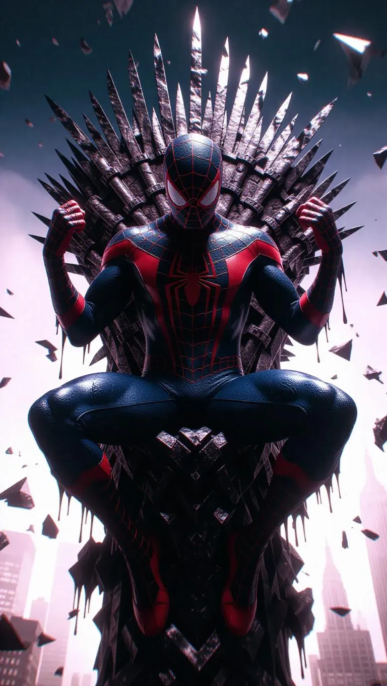 Spider-Man perched on a shattered obsidian throne, surreal nightmare dimension, New York skyline melting into liquid clock faces, biomechanical suit with pulsating veins, liquid metal webs dripping like tar, impasto CG painting, dramatic baroque lighting, hyper-detailed 32k resolution, subsurface scattering on suit, floating geometric fragments reflecting alternate realities, cinematic composition, Zdzisław Beksiński-inspired dark surrealism, Unreal Engine 5 render, trending on ArtStation, 16:9 aspect ratio, version 5, quality 2