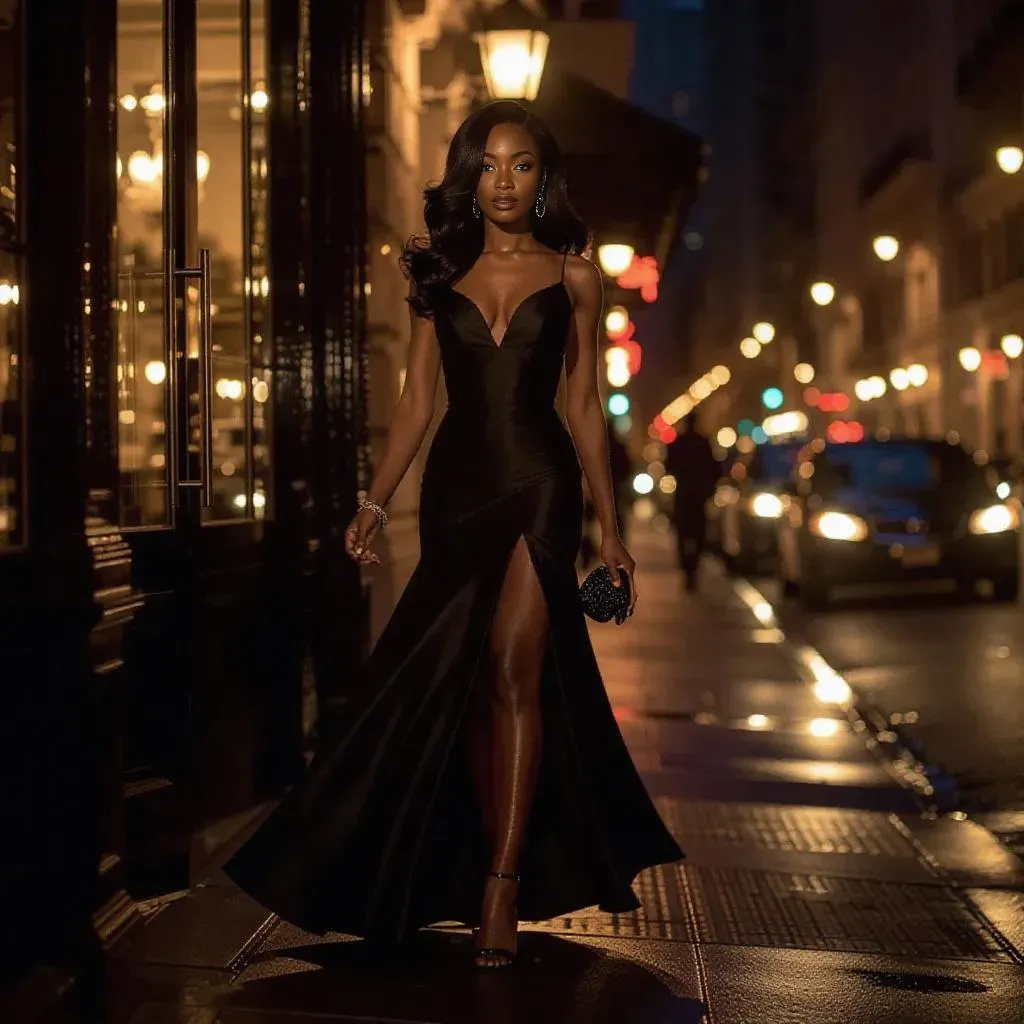 Create sophisticated AI-generated visuals of a glamorous Black woman at a chic urban restaurant entrance. Vivago.ai transforms text prompts into high-fashion scenes with warm night lighting, blurred city reflections, and modern elegance. Perfect for luxury branding, editorial content, or digital art projects. Explore AI effects for professional-grade imagery that blends realism with artistic flair.
