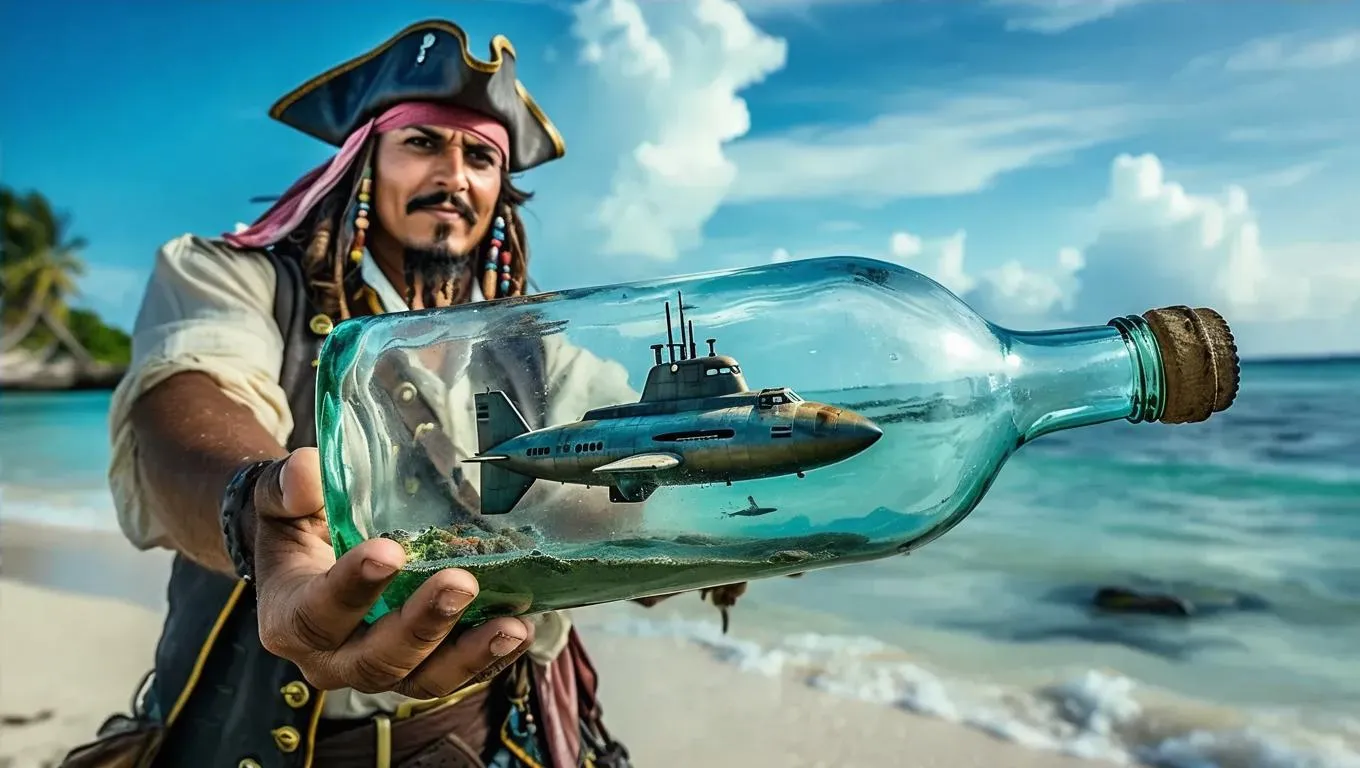 Create AI-generated visuals of a pirate holding a glass bottle with a submarine sailing inside, set on a mystical beach. Perfect for storytelling, digital art, or fantasy projects. Use vivago.ai's text-to-image tools to craft surreal scenes, enhance details, and apply professional AI effects for captivating, high-quality creative outputs.