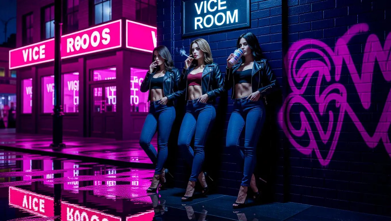 Cinematic 16:9 shot of a neon-lit street in Los Santos, inspired by GTA V. Rain-slick pavement, reflections of pink and blue club signs. Three hot female characters stand in front of a building styled like a GTA nightclub (similar to Bahama Mamas or Tony’s), leaning against graffiti-covered brick walls. Tight jeans, leather jackets, crop tops, high heels. One lights a cigarette, one scrolls her Snapmatic feed, third sips from a takeaway Sprunk cup. Club sign above says "VICE ROOM". Late-night crime city energy, stylized GTA vibe, no nudity, suggestive poses.
