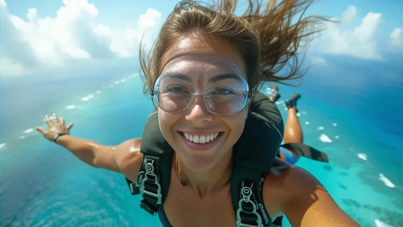 A female skydiver floating freely over a vast ocean, close-up of her face radiating pure euphoria, realistic photo, sun casting a golden glow, wind-blown hair, crystal-clear blue waters below, clouds dotting the horizon.