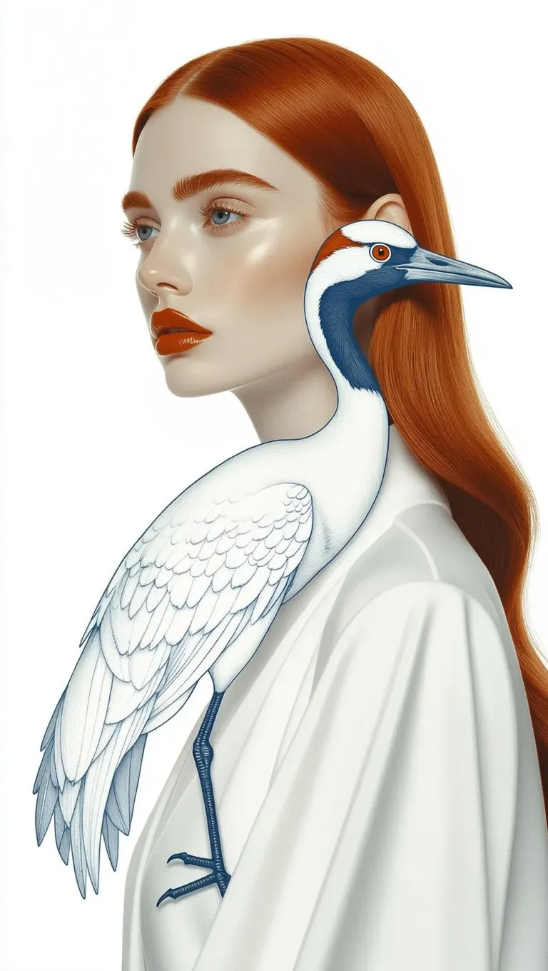 A striking hyperrealistic editorial portrait: a red-haired woman with elongated facial features and bold, sculptural eyebrows, gazes calmly forward. She wears minimalist white garments, evoking purity and balance. A majestic Chinese crane perches on her shoulder in perfect side profile, its porcelain-like feathers rendered in intricate blue scratchboard lines, echoing ancient ceramics. The bird’s eye aligns seamlessly with hers, merging identities. Set against a stark white backdrop with pristine studio lighting, the composition is serene, symbolic, and intensely detailed—merging fashion, tradition, and surreal beauty with surgical precision.