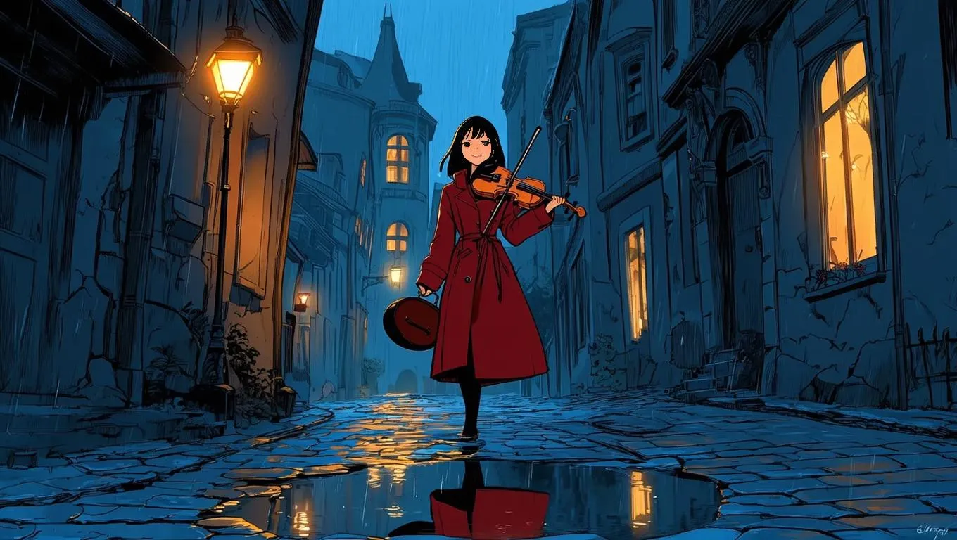 Create atmospheric anime scenes with Vivago.ai's AI tools. Transform text into cinematic visuals: rain-slick cobblestone streets, crimson-coated figures under gaslamp glow, desaturated blues and sepia tones. Generate watercolor-style graphics, dynamic perspectives, and reflective details for professional-grade storytelling. Perfect for anime art, graphic novel aesthetics, and moody atmospheric imagery. #AnimeArt #CinematicAI #WatercolorEffects #AIVisuals
