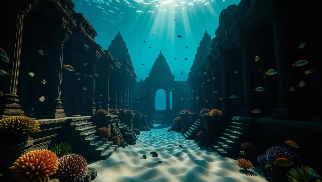 Generate hyper-realistic underwater scenes of ancient Indian ruins submerged in deep blue waters. AI creates sunlit coral reefs, vibrant fish, and decaying architecture with organic textures. Craft cinematic ultra-wide shots featuring Asian-inspired tiered buildings, archways, columns, and teal sandy bottoms. Transform prompts into vivid visuals with Vivago.ai's precision tools for lifelike aquatic world-building.