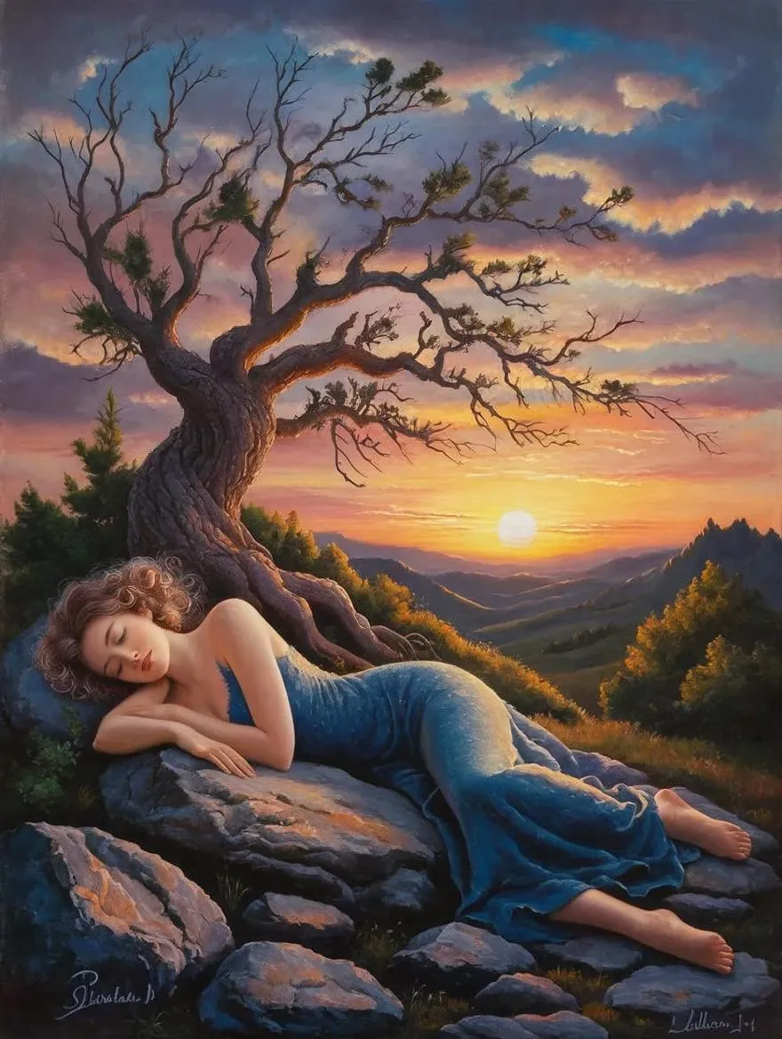 Transform text into surreal AI art with vivago.ai. Generate Dalí-inspired oil paintings of a fantasy woman with a tree-like body, ethereal beauty, and mystical landscapes. Sunset backgrounds, vibrant skies, branches merging with hair, serene expressions—create enchanting, dreamlike visuals effortlessly.