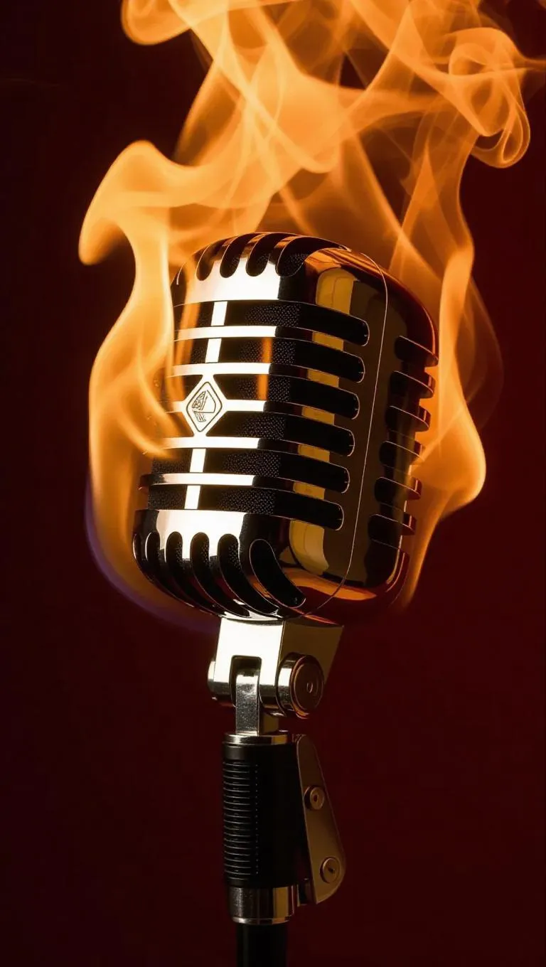 Vintage broadcast microphone ablaze with golden flames against deep burgundy. AI-generated art merges dancing firelight, curling smoke wisps, and warm sepia tones. Theatrical lighting transforms this musical instrument into a passionate performance emblem. Explore professional-grade creative energy with vivago.ai's AI effects for dramatic text-to-visual transformations.