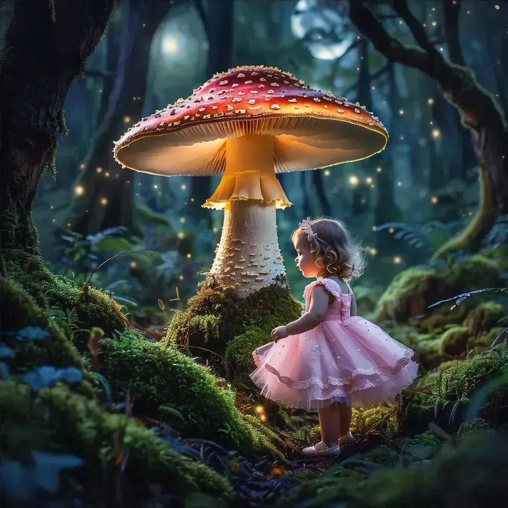 Create a magical enchanted forest scene with a gigantic glowing mushroom and mystical lighting. Generate fantasy visuals of a toddler girl in a pink dress amidst lush green moss using AI image tools. Perfect surreal landscape photos with ethereal atmosphere and night ambiance. Transform text prompts into professional fantasy visuals with vivago.ai's creative AI effects.