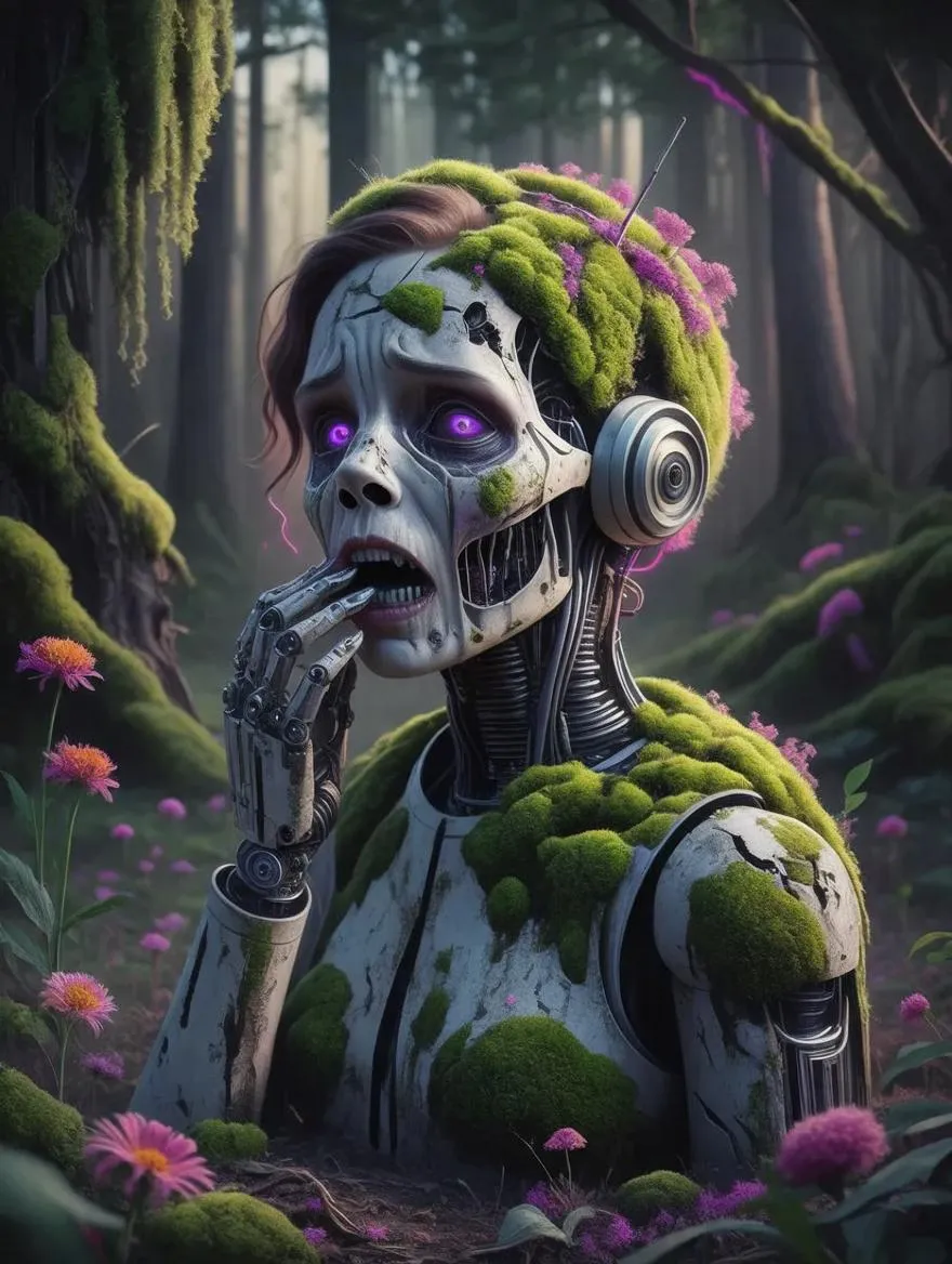 Transform text into vivid AI art with vivago.ai's neon punk-style decaying android in a wild forest. Hyper-realistic cyberpunk vaporwave fusion: rustic prosthetics, lush mold, cracked face meets sleek ultramodern design. Magenta highlights, dark purple shadows, high contrast cinematic visuals. Ultra-detailed, vibrant, professional-grade renaissance-inspired cyberpunk masterpiece.
