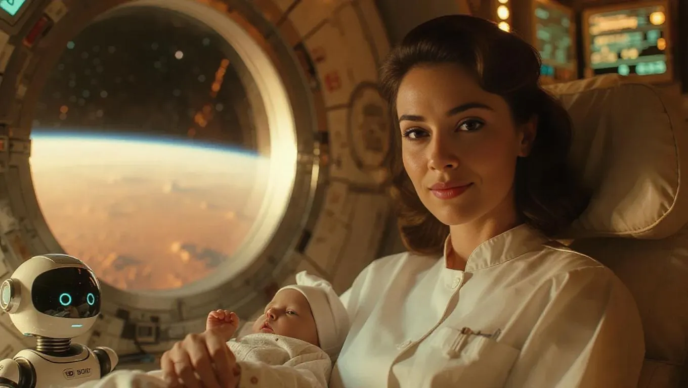 Step into a retro-futuristic atompunk space station hospital room with 1950s sci-fi charm. A 45-year-old woman in a medical gown bonds with her newborn, aided by smiling robot nurses. Alien planet vistas through vast windows, Sony Alpha 7 camera details, high-resolution textures, and intricate atompunk designs merge nostalgia with futuristic AI-generated artistry.