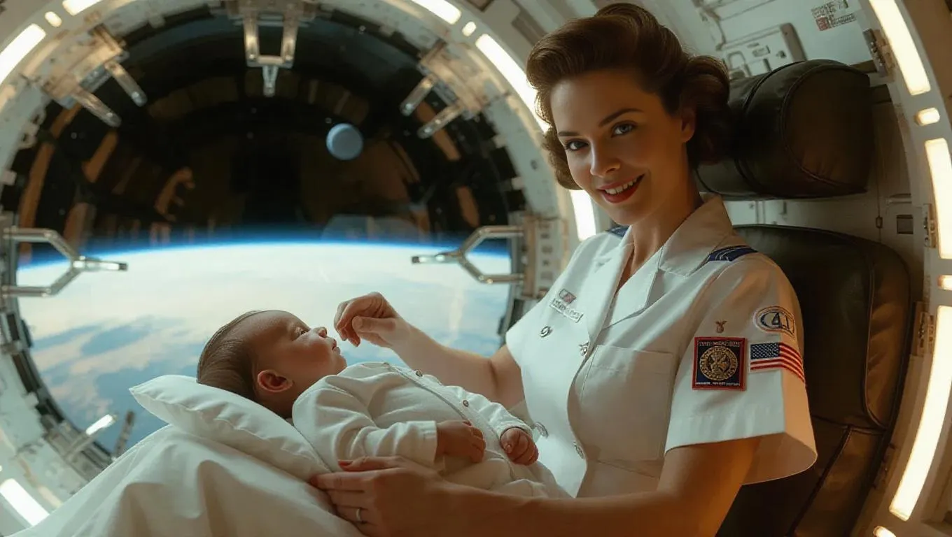 Step into a retro-futuristic atompunk space station hospital room with 1950s sci-fi charm. A 45-year-old woman in a medical gown bonds with her newborn, aided by smiling robot nurses. Alien planet vistas through vast windows, Sony Alpha 7 camera details, high-resolution textures, and intricate atompunk designs merge nostalgia with futuristic AI-generated artistry.