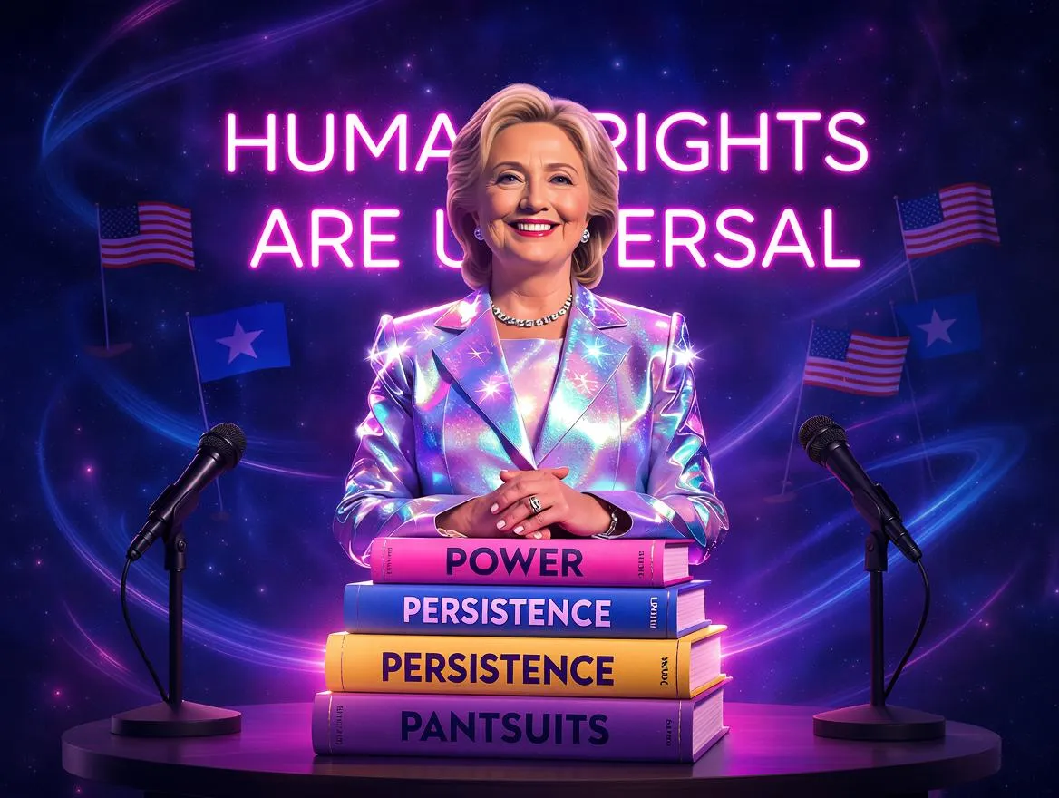 Generate satirical political art with AI! This hyper-stylized Hillary Clinton portrait merges sci-fi glam, pop-art symbolism, and celestial motifs. Features futuristic armor-blazers, cosmic diplomacy backdrops, and neon activism slogans. Perfect for humorous yet empowering visuals with Vogue-cover polish. Explore AI-powered creativity for surreal editorial charm.