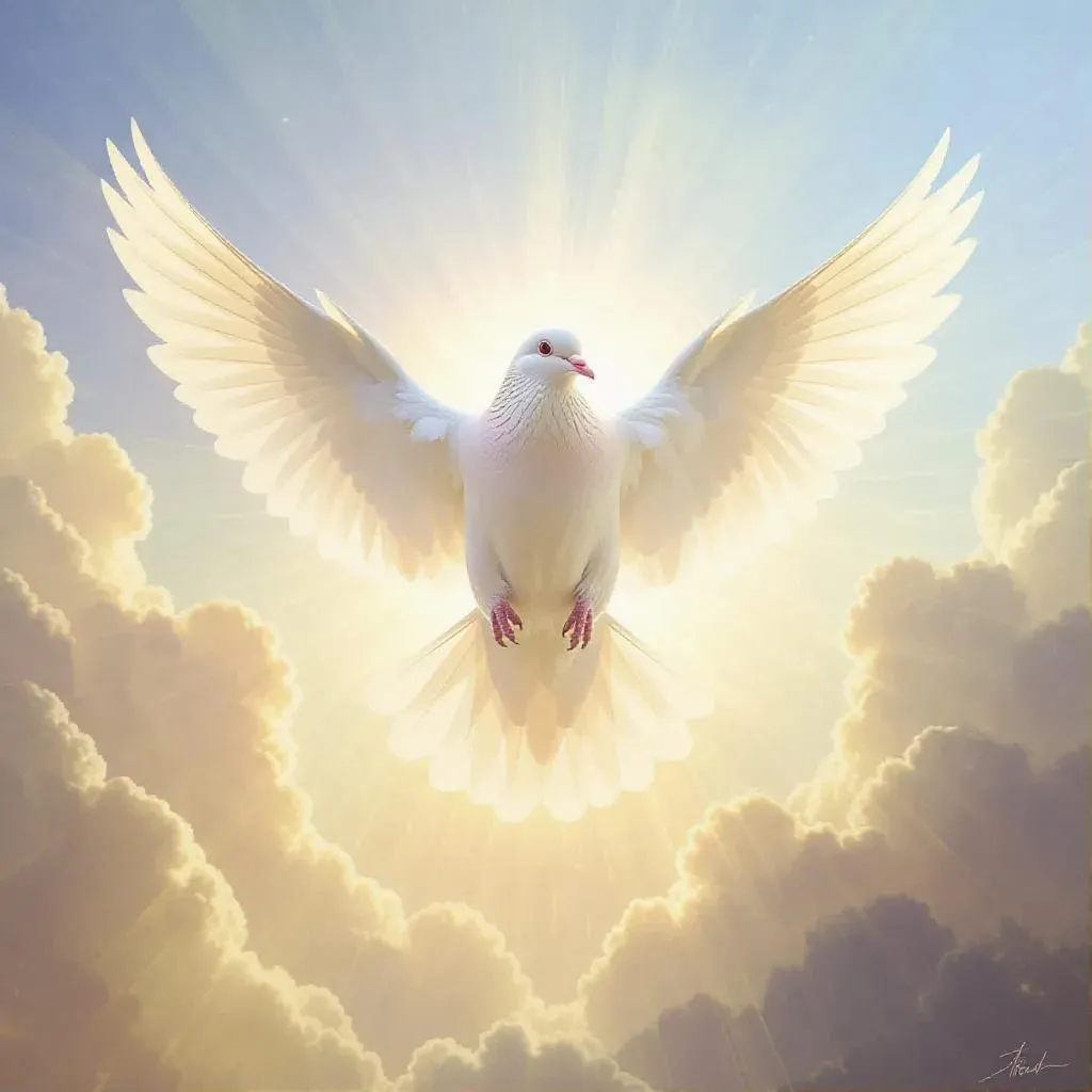 Create a heavenly dove embodying the Holy Spirit with radiant light and divine aura. Descending gracefully amid soft clouds and golden skies, this ethereal scene uses rule of thirds for balanced serenity. Achieve traditional realism with VivaGO.ai's AI tools for peaceful, spiritually symbolic imagery.