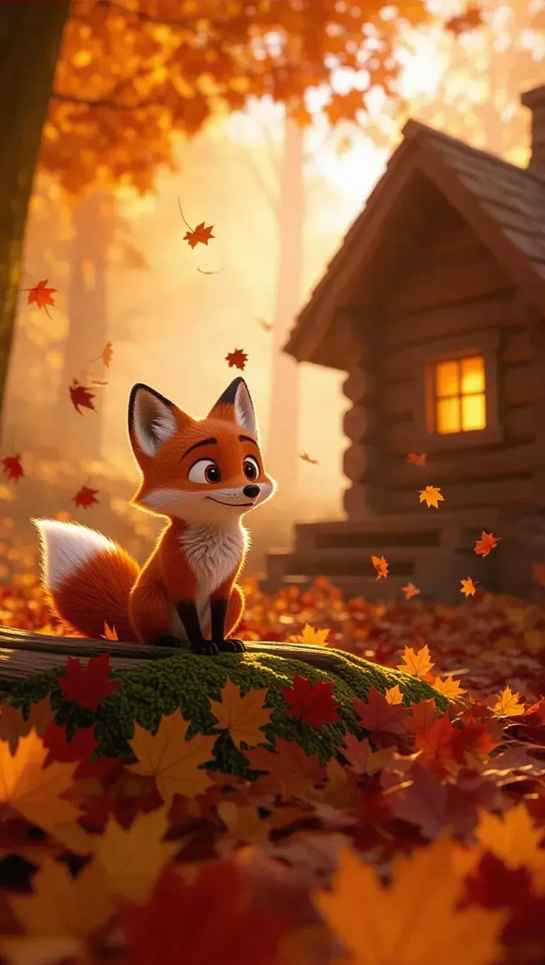 Create a Pixar-style autumn forest scene with a cozy cabin, cartoon fox, and animated falling leaves. Generate 4K AI art using NPR rendering, ultra-detailed textures, and cinematic depth for nostalgic storytelling. Perfect for animations, illustrations, and professional-grade visual effects with misty atmosphere and soft golden sunset lighting.
