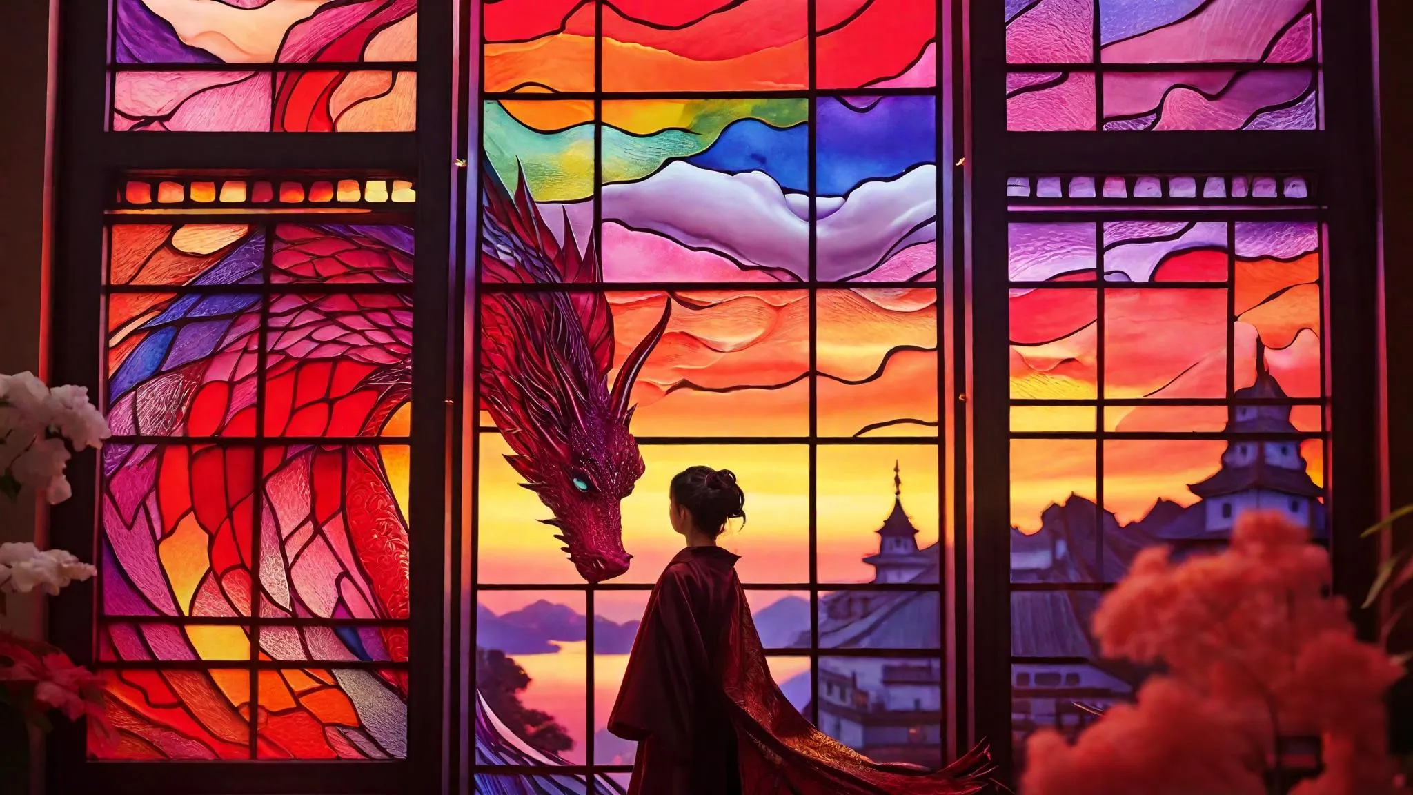 Transform text into cinematic AI visuals with 90s film grain. A red sky backdrop, flying dragon, and vibrant stained glass window with square panels evoke the nostalgic, ethereal atmosphere of "Memoirs of a Geisha." Create dreamlike scenes using AI-powered tools for professional-grade, cinematic imagery. Craft vivid stories with Vivago.ai's realistic effects and curated editing features.