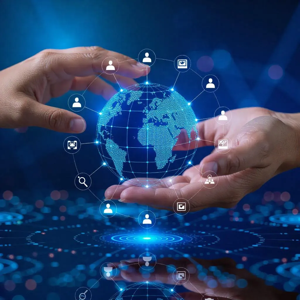 Explore AI-generated digital marketing visuals with a glowing hexagon globe symbolizing global connectivity. Features SEO, social networks, mobile, and video icons linked by dynamic data flows. Futuristic blue-purple tech backdrop highlights AI-powered creativity for websites, apps, and campaigns. Perfect for tech-driven branding and digital strategy imagery.