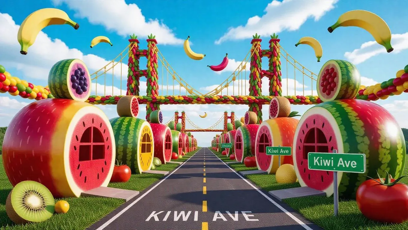 Explore an AI-generated surreal fruit cityscape with banana bridges, kiwi shelters, and watermelon structures. Vivago.ai transforms creative prompts into vibrant visuals, crafting dreamlike scenes like Kiwi Ave road signs and dragon fruit skylines. Unleash your imagination with professional-grade AI effects for unique, fantastical urban landscapes.