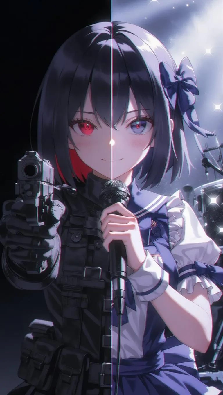 (masterpiece, best quality, ultra-detailed, 8k, dramatic split composition, dual identity, cinematic lighting), a split-screen anime girl shown in two halves, same person, facing forward with a calm and confident expression, left half: dark background, dressed in black tactical gear, holding a pistol aimed forward, red glowing eyes, assassin persona, shadows and tension, right half: bright concert stage background, idol outfit with frilly blouse and ribbon, holding a microphone, smiling warmly, sparkling lights, perfect symmetry, one person with two identities, symbolic contrast between light and shadow, high resolution, expressive eyes, dynamic contrast